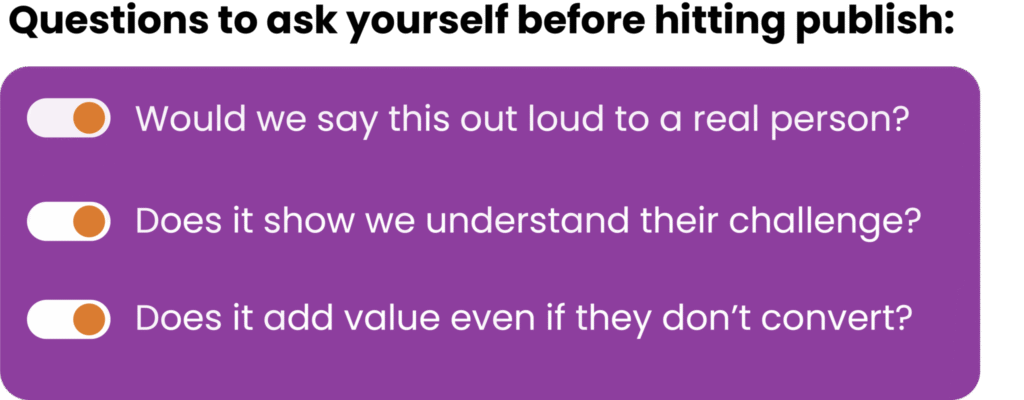 B2B content cannot sound robotic. Writing needs to respect the reader’s time, pain points, and intelligence. Be useful. Be clear. And do not be afraid to be human.